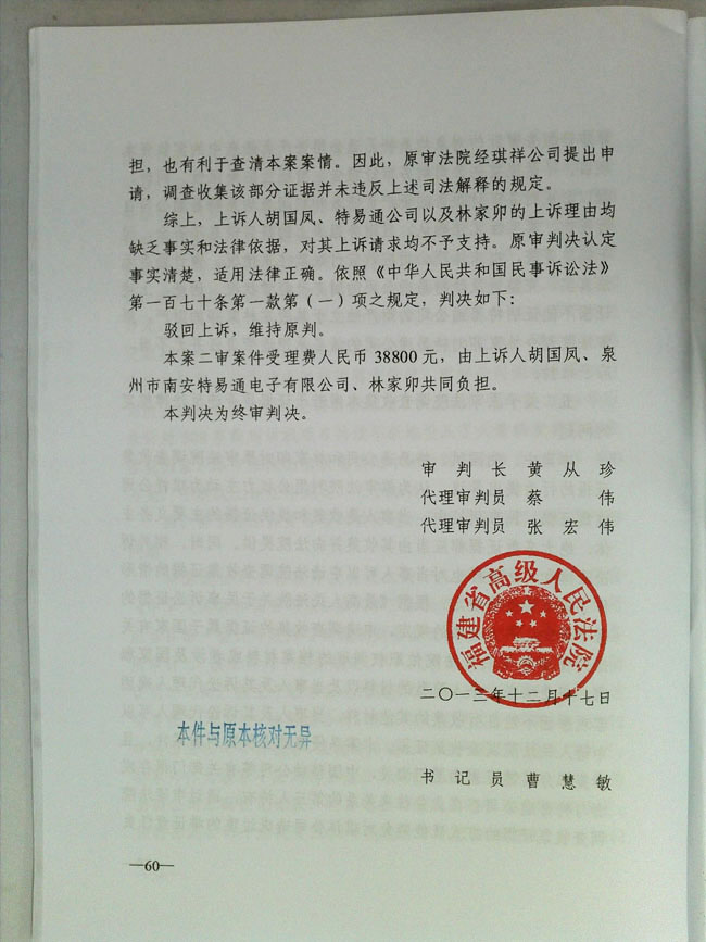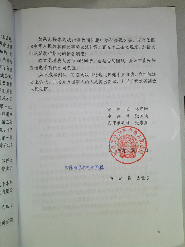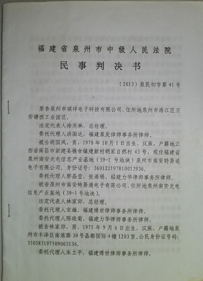 A. Based on the Evidence presented to the Courts the Plaintiff, the Intermediate People's Court of Quanzhou City announced after trial on June 17, 2013 the following verdict. (Reference Civil Suit Trial No. 41 Quanzhou (2013):